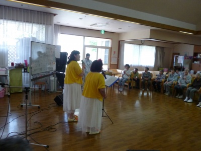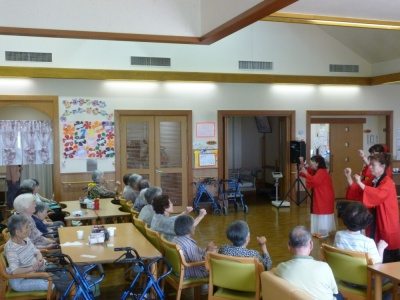 「虹いろの風」の皆さんは、利用者様と一緒に歌や踊りを繰り広げ、フロアー内を笑顔いっぱいにして下さいます