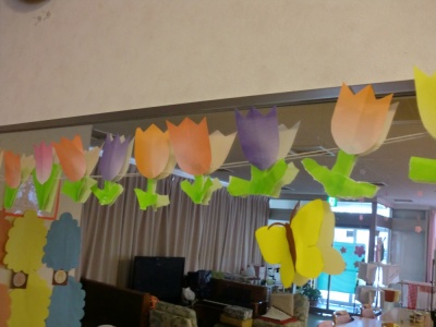 あっぷるデイサービス明石にも、チューリップや桜の花が咲き乱れ(?)、不器用なスタッフの作った蝶々も飛び交っています。