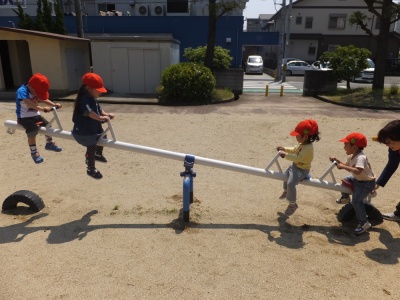 今日はお天気が良かったので、お揃いの赤い帽子をかぶって、近くの公園へお出かけしました。