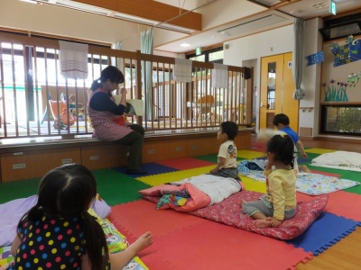 お昼寝前に先生が絵本を読んでくれるので、みんな座って静かに聴いています。