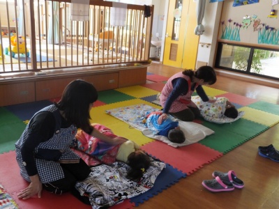 絵本の後は、先生にトントンとしてもらいながら夢の中へ・・・。