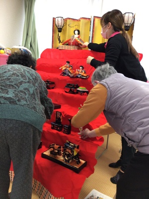 毎年恒例の雛飾りを一緒にだしていただき、「これ、どこに飾るんですか~」「どこやったかな~」と楽しく飾り付けが出来ました。