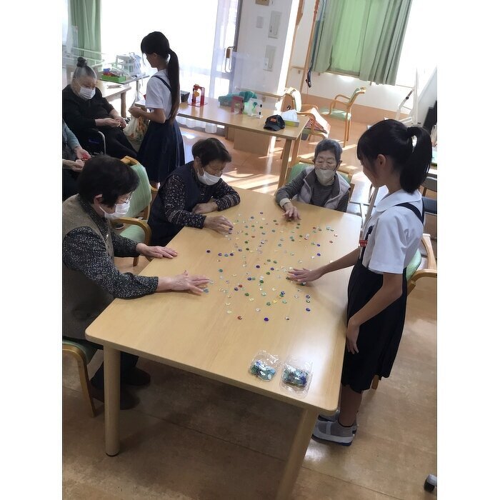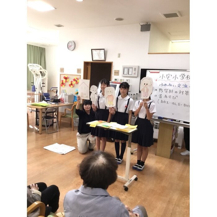 11月23日(土)小宅小学校の音楽会にご招待頂きました。 1学年100名以上の生徒さんの元気な歌声と見事な演奏に利用者様も感動されていました。 後日、6年生3名の生徒さんが授業の一貫でふれあい交流会として来所して下さり、防災対策について紙芝居仕立で分かりやすく伝えてくれたので利用者様にしっかり伝わりました。 そのあとはお手玉・おはじき・けん玉を使って昔遊びで盛り上がりました。 お互いに教えあったり、競ったりで利用者様も童心に還り楽しい時間を過ごす事が出来ました。