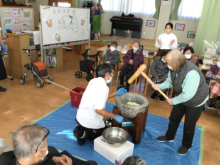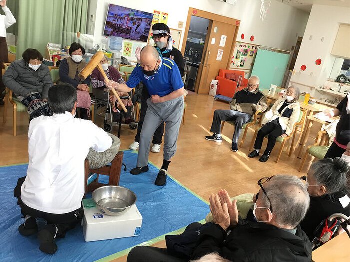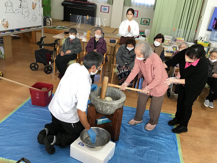 12月19日(木)株式会社入船様のご協力のもと、餅つき会を開催しました。 ご利用者様は昔を思い出しながら、周りの皆様の手拍子に合わせペッタンペッタンとリズム良くついてくださいました! そのあとは温かい白玉ぜんざいを召し上がられほっこりしたひと時を過ごされました。