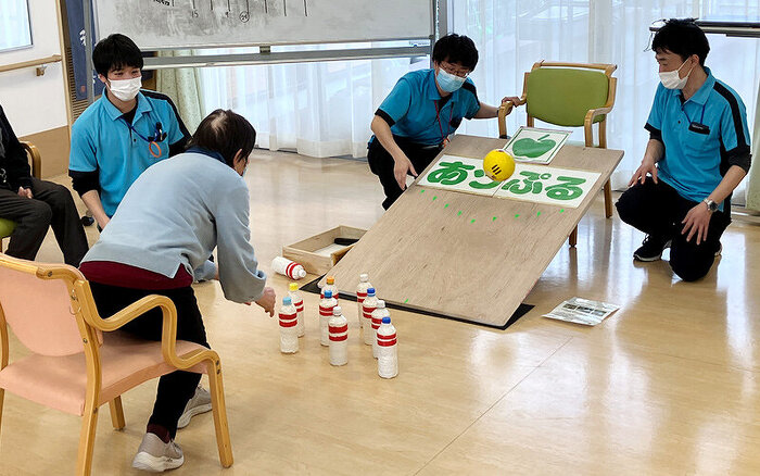 2月14日にデイサービス明石・明石西・加古川の利用者様と合同で、リバースボウリング大会を行いました。 通常のボウリングでは無く、斜めに立てかけたスロープにボールを投げ、その勢いでピンを倒すレクリエーションです。 3チームに分かれ、タンバリンや掛け声で応援していただき、非常に盛り上がりました。 結果は「引き分け」になりましたが、「次も参加したい!」と大盛況で終了しました。